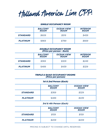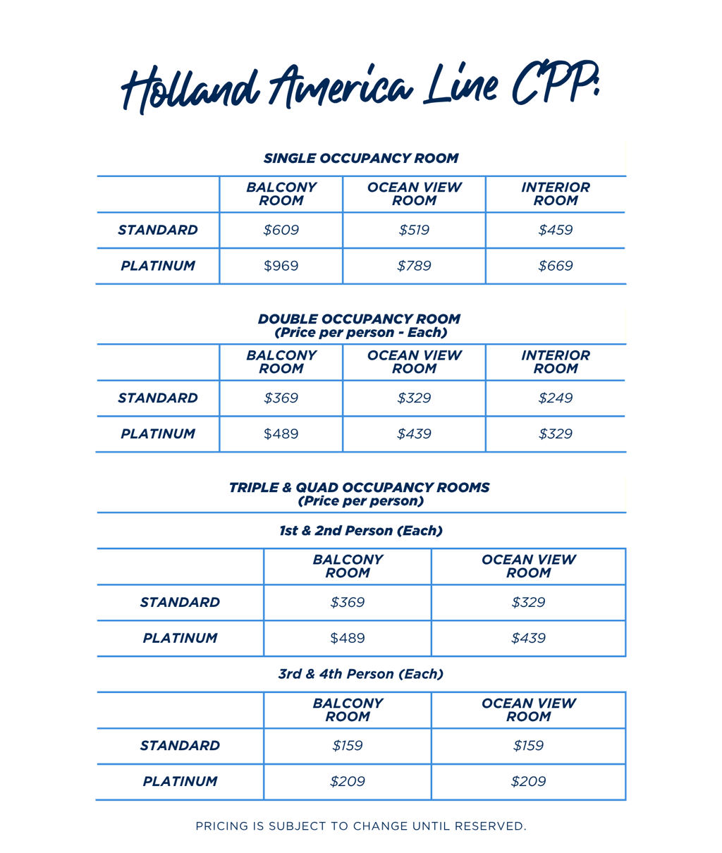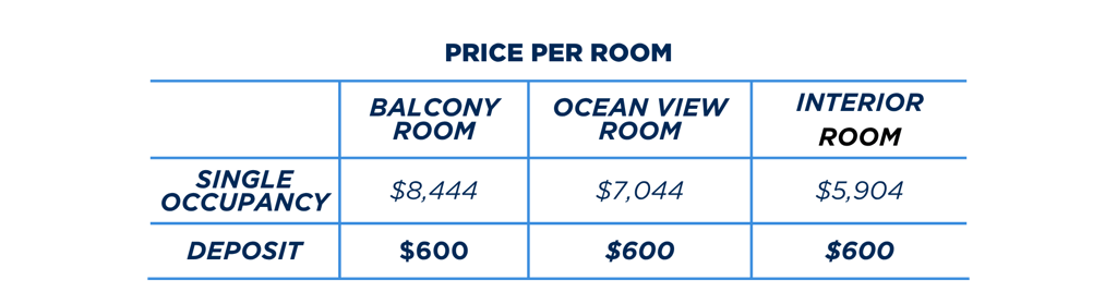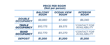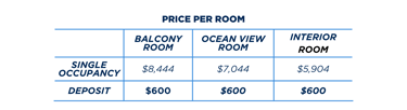 Pricing is based on cabin type and the number of guests in the stateroom.