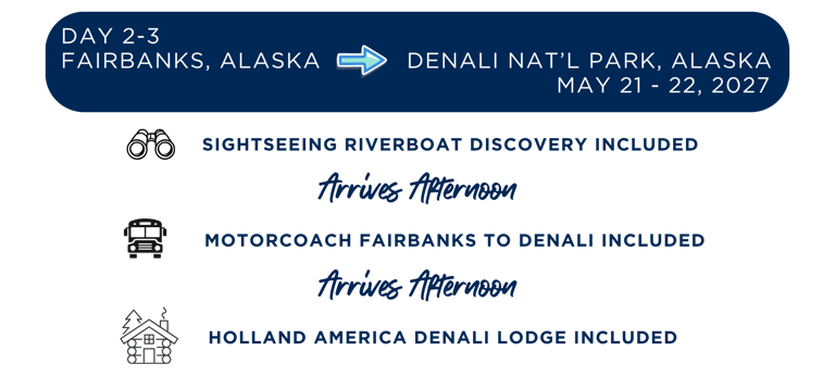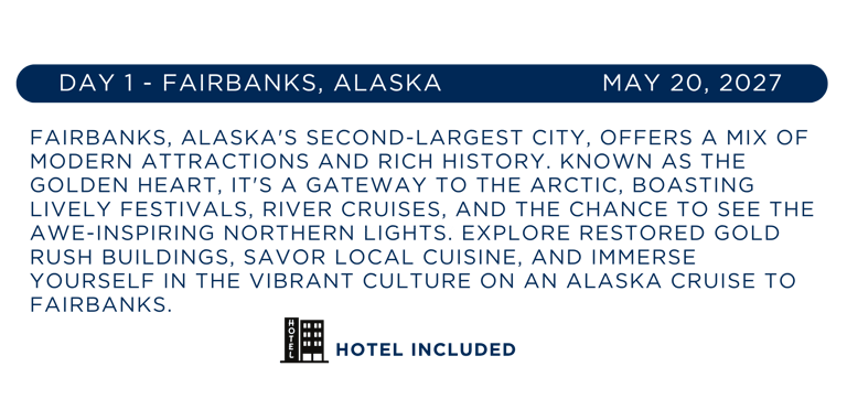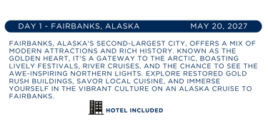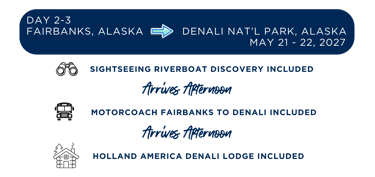 You should plan to arrive in Fairbanks at least one day prior to the start of the land portion of your trip.