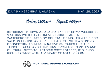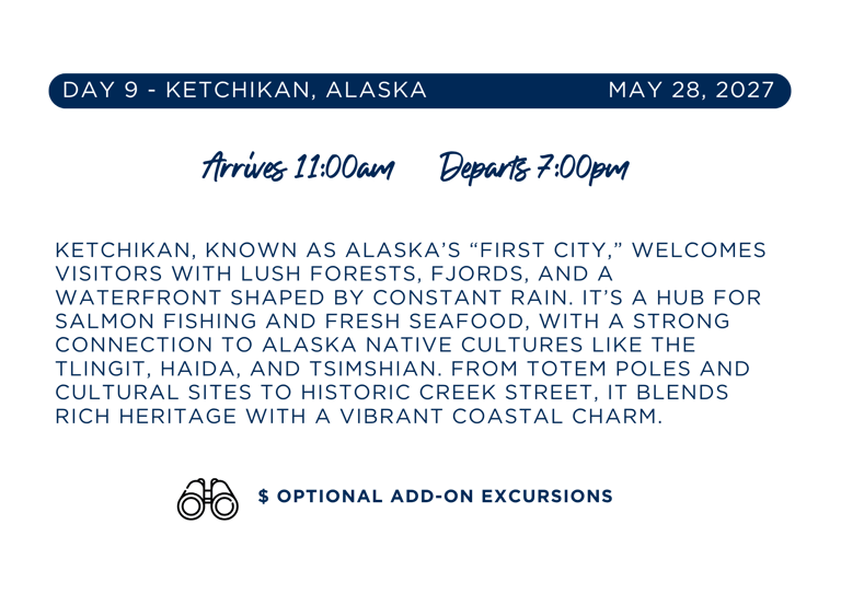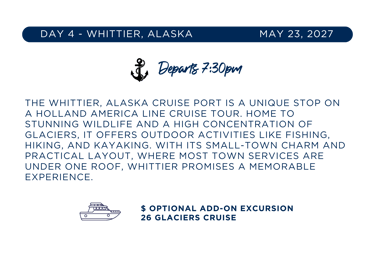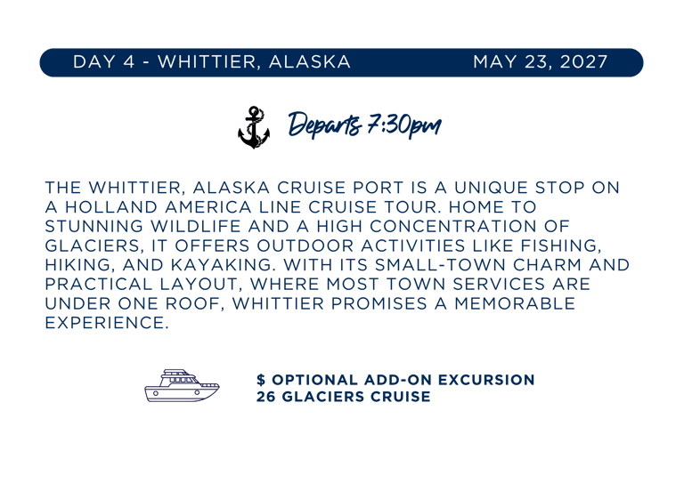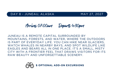 Travel protection helps protect your investment in case of unexpected events such as trip cancellations, medical emergencies, delays, or interruptions. Because this is a multi-day Alaska cruisetour with both land and cruise components, travel protection is highly recommended.