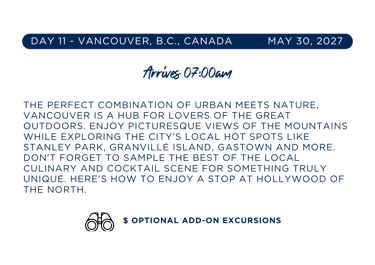 Yes, this itinerary includes travel into Canada, and all travelers are responsible for meeting entry requirements.