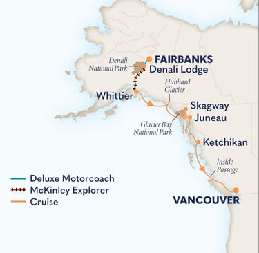 Start in Fairbanks → Denali → Whittier → Cruise through Alaska → End in Vancouver