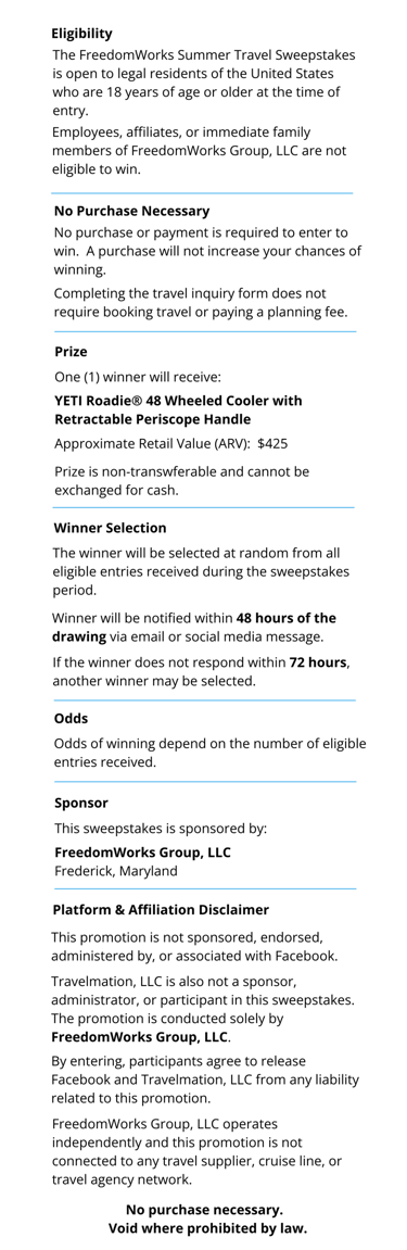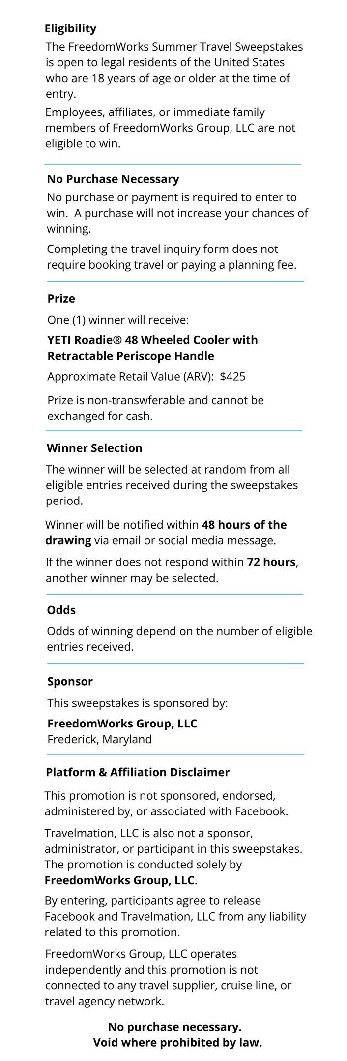 Enter the FreedomWorks Group, LLC Summer Travel Sweepstakes for your chance to win the ultimate cooler for road trips, cruises, tailgates, and camping adventures.